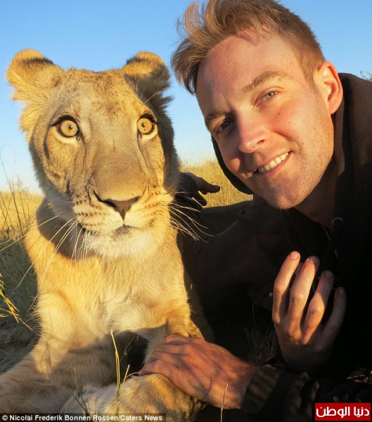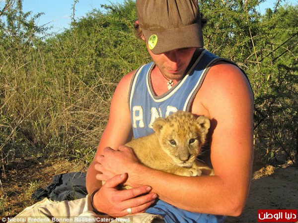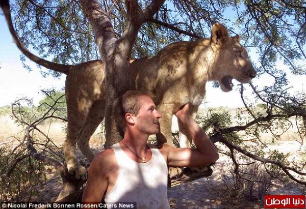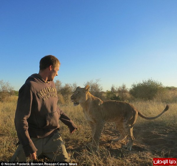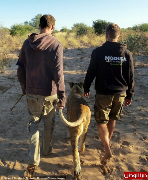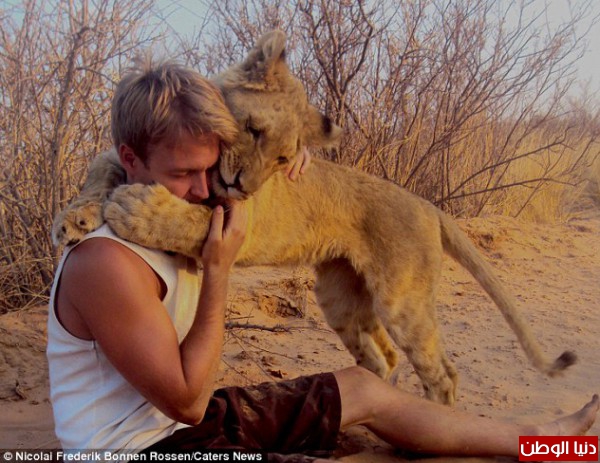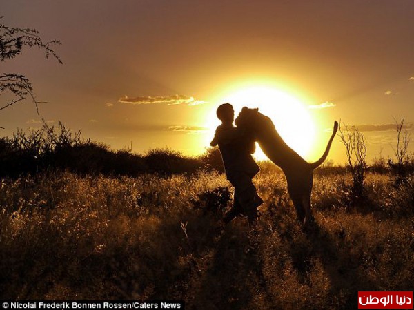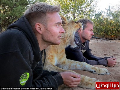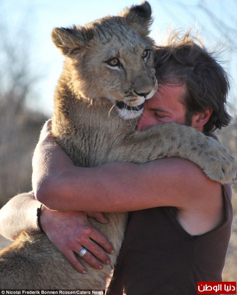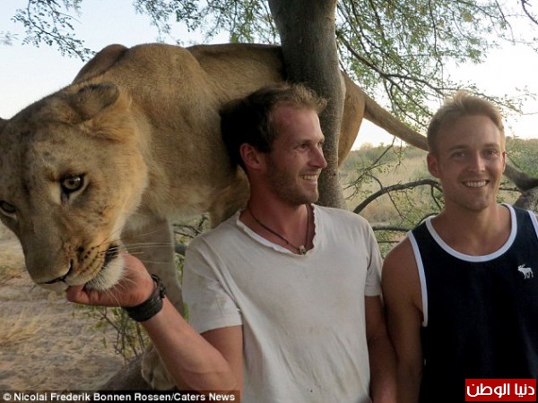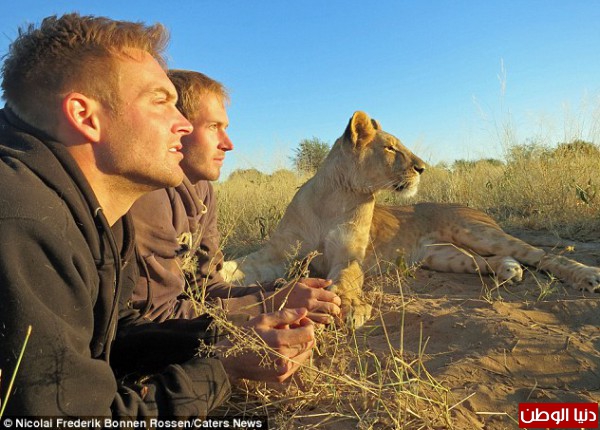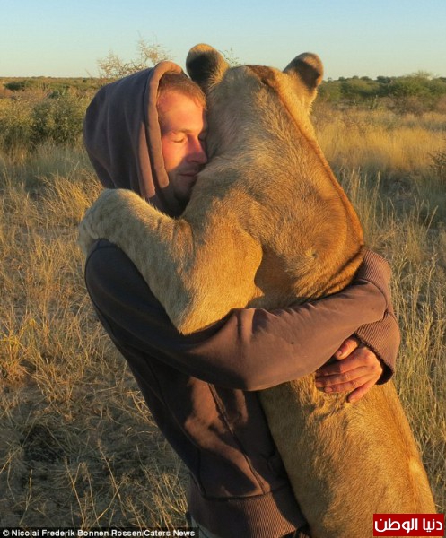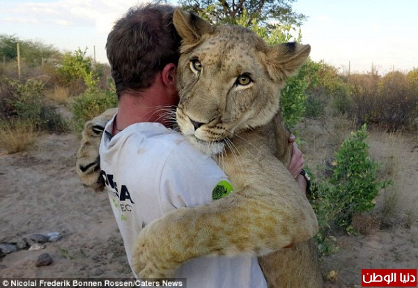 بالصور : بعد أن أنقذا حياتها .. لبؤة تحتضن رجلين كلما رأتهم