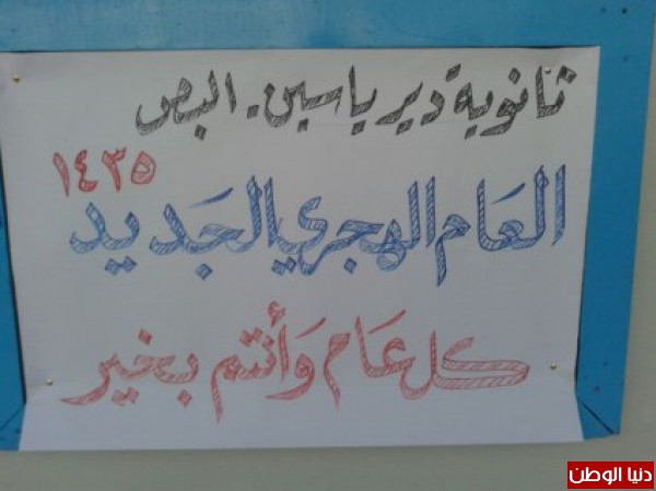 بمناسبة السنه الهجرية الجديدة 1435 أحيت ثانوية دير ياسين هذه المناسبة بآيات من الذكر الحكيم تلاها الطالب قتيبة سليم ثم كلمة لفضيلة اﻷستاذ الشيخ حسن ذياب حيث استعرض لنا مآثر الهجرة وأهم دروسها وما نتج عنها عبر وبناء دولة الاسلامية .
