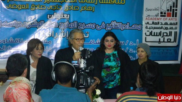 المخرج صقر الرشود وماتوصلت اليه حيث أرتباط المخرج صقر الرشود بالشكسبيريات وتأثره بهم فى أعماله الفنية كما أشارت الى أهمية التقريب بين المسرح الطبيعي والواقعي وذلك بالبحث فى مناهج المسرح المختلفة وتوضيح لماذا ضاعت معظم أعمال صقر الرشود وما تعانيه الفنون العربية فى تلك الفترة حيث الأهمال فى التدوين ومع انتهائها مباشرة بدأت المناقشة من جهة د نادية كامل حيث أشادت بما أحتوته رسالة الباحثة رهام العوضي من جهد وأبحاث أعتمدت اغلبها على مخطوطات نادرة.