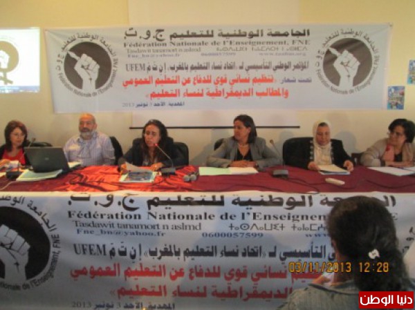 انعقد يوم الأحد 3 نونبر 2013 بالمهدية المؤتمر التأسيسي لـ "اتحاد نساء التعليم بالمغرب UFEM" كجمعية نسائية مرتبطة بالجامعة الوطنية للتعليم، وذلك تحت شعار "تنظيم نسائي قوي للدفاع عن التعليم العمومي والمطالب الديمقراطية لنساء التعليم بالمغرب" حيث تم التداول والنقاش حول وضعية نساء التعليم بالمغرب والمَطالب الخاصة بهن، وأسفرت أشغال المؤتمر على المصادقة على مجموعة من المقررات، وتم انتخاب لجنة إدارية وطنية من 49 عضوة والتي انتخبت مكتبا وطنيا من 21 عضوة اللواتي وزعن المهام على الشكل التالي: