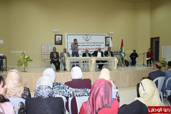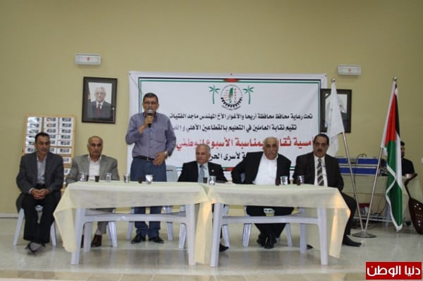 العاملين في التعليم بالقطاعين الاهلي والخاص ,وبحضور الوكيل المساعد لوزارة التربية والتعليم جهاد زكارنة وجهاد ابو العسل امين سر حركة فتح وعضو المجلس الثوري لحركة فتح صائب نظيف ومدير التربية والتعليم بالمحافظة محمد الحواش.