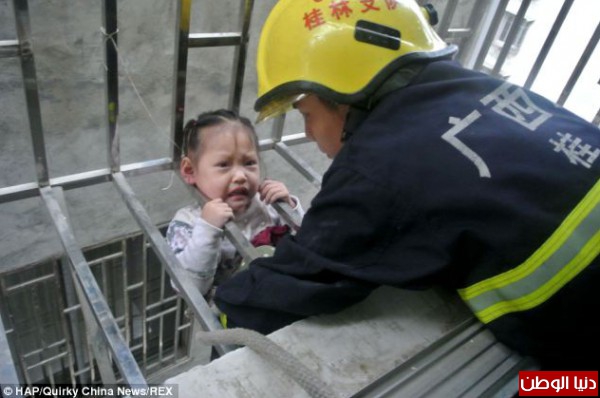 تم العثور على فتاة في الثالثة من عمرها في الصين من خلال رقبتها التي كانت تتدلى رقبتها من نافذة منزلهم في الطابق الرابع بعد أن تركها والداها لوحدها في المنزل وذهبا إلى عملهما .