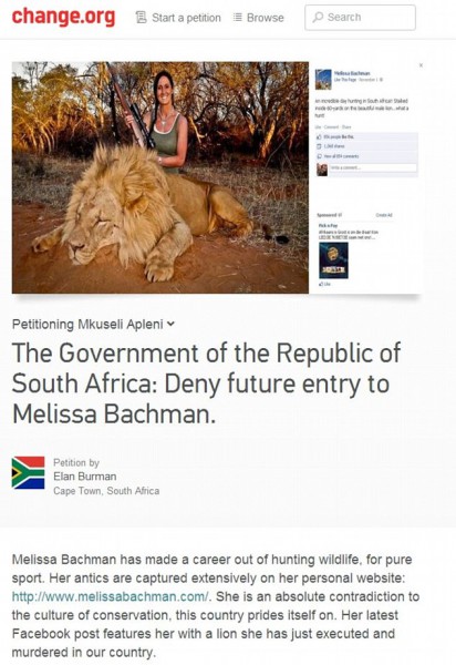 وبعد ساعات من نشرها الصورة , تم إطلاق عريضة على الانترنت عن طريق القائمين في كيب تاون تطالب حكومة جنوب أفريقيا بحظر باخمان من الصيد وترحيلها إلى بلادها .
