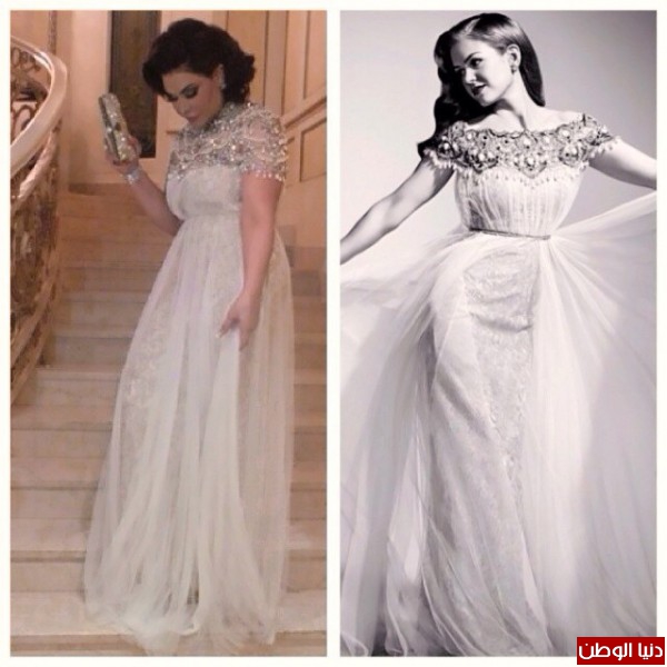 حيث نشرت مجموعة جديدة من الصور عبر الفيس بوك وانستجرام وهي ترتدي فستان أبيض من " marchesa "تميز بطبقته من الدانتيل وفوقه تول ابيض شفاف، ويأتي الثوب من الاعلى مزين بالمجوهرات بالسلاسل الفضية والكريستال.