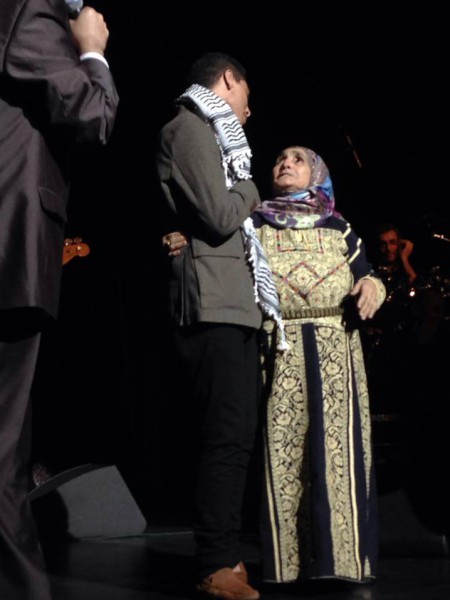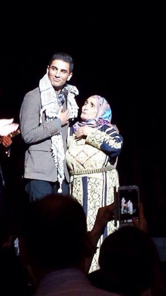 وبدا عساف في الصورة وهو يظهر كل الحب والاحترام لتلك العجوز التي زاحمت المعجبين وقطعت المسافات فقط لتشاهد ابن بلدها .