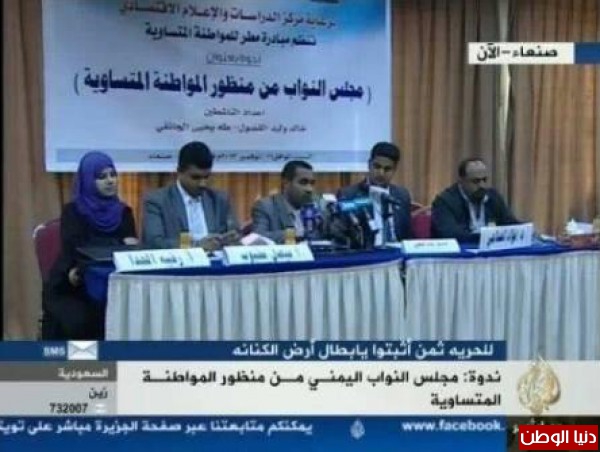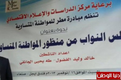برعاية مركز الدراسات والإعلام الاقتصادي أقامت مبادرة مطر للمواطنة المتساوية أمس السبت ندوتها بعنوان مجلس النواب من منظور المواطنة المتساوية بمشاركة كل من : الدكتور فؤاد الصلاحي أستاذ علم الاجتماع بجامعة صنعاء، والاستاذ فيصل محبوب الباحث السياسي والناشطة السياسية الأستاذة/ رقية الحداء وقد تخلف عن الحضور عضوا مجلس النواب سلطان العتواني وياسر العواضي اللذان كانا من المفترض ان ينقلا وجهة نظر أعضاء مجلس النواب حول الموضوع وقد تحدث في بداية الندوة الاستاذ مصطفى نصر رئيس مركز الدراسات والإعلام الاقتصادي عن أهمية مثل هذه الندوات في الوقت الراهن والتوعية بمثل هذا الموضوع شاكر للشباب جهودهم في أثراء النقاش حول مثل هذه المواضيع.
