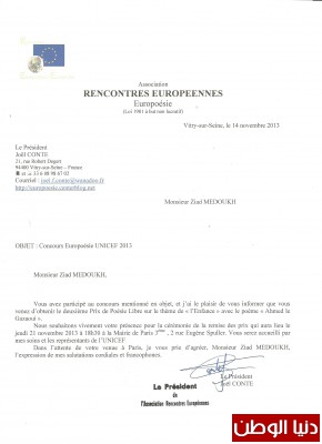 أعلنت مؤسسة الشعر الأوروبية ومقرها باريس بفرنسا فوز الدكتور زياد مدوخ رئيس قسم اللغة الفرنسية بجامعة الأقصى,كاتب وشاعر باللغة الفرنسية بالجائزة الثانية بمسابقة الشعر الدولية المنظمة من طرف المؤسسة حول موضوع الشباب والطفولة في العالم بالتعاون مع مؤسسة الطفولة العالمية-اليونيسيف