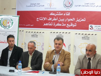 وقعت النقابة العامة للعاملين في الزراعة والصناعات الغذائية في مقر الاتحاد العام لنقابات عمال فلسطين مذكرة تفاهم بينها وبين الاتحاد العام للصناعات الغذائية وذلك بحضور الامين العام لاتحاد نقابات عمال فلسطين شاهر سعد ورئيس النقابة العامة للزراعة والصناعات الغذائية ابراهيم ذويب والامين العام لاتحاد الصناعات الغذائية المهندس فؤاد الاقرع ومنسق المشروع التثيقيفي الفلسطيني الدنمرك مهدي حمدان وجمع غفير من العمال العاملين في مجال الزراعة والصناعات الغذائية واعضاء النقابة العامة للزراعة.