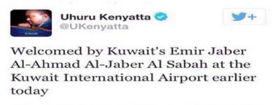 أثارت تغريدة للرئيس الكيني “أوهورو كينياتا” على موقع التواصل “تويتر” تندر الكثير من المغردين عندما اتضح أنه لا يعرف اسم الشيخ صباح الأحمد أمير دولة الكويت ، معتقداً أنه (جابر الأحمد) كما ذكر في تغريدته تلك على حسابه الشخصي، حيث علق بها على صورة استقباله في مطار الكويت الدولي صباح أمس من قبل الشيخ صباح .