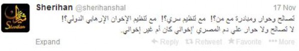 أعلنت النجمة المصرية شريهان رفضها لأيّ مفاوضات أو مصالحة مع تنظيم الإخوان المسلمين أو مع أي شخص تورط في إراقة الدم المصري، وأعلنت ذلك عبر حسابها الخاص على موقع التواصل الإجتماعي تويتر حيث كتبت: “تصالح وحوار ومبادرة مع من؟! مع تنظيم سري؟! مع تنظيم الإخوان الإرهابي الدولي؟! لا تصالح ولا حوار علي دم المصري ’إخواني كان أم غير إخواني.”