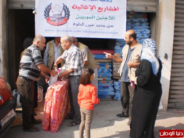 مع اقتراب فصل الشتاء قامت جمعية الفرقان للعمل الخيري في مخيم عين الحلوة وبالتنسيق مع لجنة نازحي فلسطينيي سوريا في لبنان بتوزيع فرش وحراما وادوات تنظيف لمائة عائلة نازحة سورية من المسجلين لديها في شهر 9- 10 / 2013.