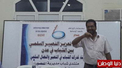 عقد صباح السبت الموافق 23-11-2013 م المنتدى الشبابي السادس في مديرية صيرة والذي كرس لمناقشة موضوع تعزيز التعبير السلمي بين الشباب في محافظة عدن والذي ينظمه مركز دراسات الرأي العام والبحوث الاجتماعية (مدار) وقد افتتح هذا المنتدى الساعة التاسعة في قاعة الارجوانة في كريتر بكلمة ترحيب بالمشاركين من قبل مدير المركز د.فضل الربيعي الذي تحدث عن أهمية المشروع والخطوات التي تم تنفيذها , حيث تتمثل أهداف المشروع في الحفاظ على سلمية المظاهرات وتنظيمها وتعزيز العلاقة بين المكونات الشبابية والناشطين في الميدان وإثراء ثقافة التسامح ولغة الحوار ,وقبول الآخر , وأكد الربيعي في كلمته على أهمية هذه الاحتجاجات والمظاهرات في هذه المدينة التي سبقت كل مدن المنطقة بثقافتها المدنية والحضارية الذي ينبغي الحفاظ على الأسلوب الحضاري والمدني لمدينة عدن .