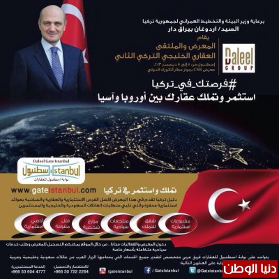 و اعلان عدد من مشاريع استثمارية خليجية تركية برأسمال خمسة مليار دولار وعليه تتولى اضخم شركة استثمارية عقارية بتركيا تحت اسم بوابة اسطنبول الفعاليات خلال الايام القليلة القادمة حيث تنظم مجموعة دليل تركيا نشاطها الرائد من خلال شركة بوابة اسطنبول للاستثمار العقاري بتوجيه الدعوات لكبار