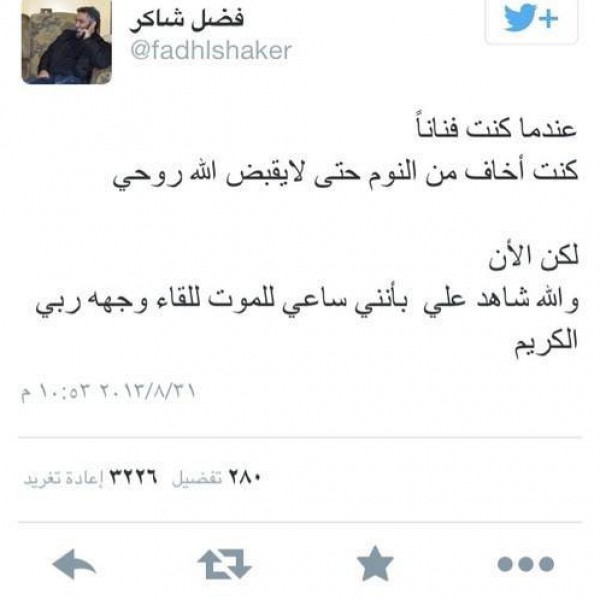 تداول نشطاء الفيس بوك منشورا كان الفنان اللبناني المعتزل فضل شاكر قد وضعه في شهر آب وكتب فيه : " عندما كنت فنانا كنت أخاف من النوم حتى لا يقبض الله روحي ..لكن الآن والله شاهد علي بأنني ساعي للموت للقاء وجهه ربي الكريم ".