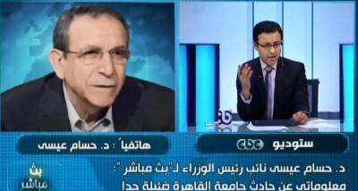 وقعت مشادة كلامية بين مقدم برنامج "بث مباشر" الإعلامي محمد سعيد محفوظ على قناة سي بى سى2، ونائب رئيس الوزراء، حسام عيسى، أثناء مداخلة هاتفية للأخير مع البرنامج، ظهر خلالها بدون معلومات عن الأسباب الحقيقة لوفاة طالب بكلية الهندسة، أثناء الاحتجاجات التي شهدتها جامعة القاهرة، اليوم.