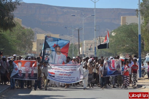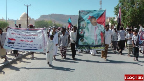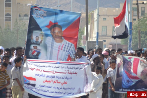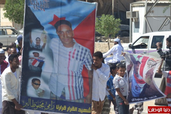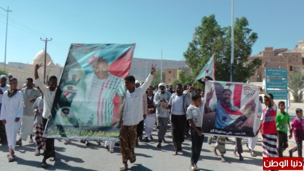 عقب صلاه الجمعه خرجت مسيرة حاشده انطلقت من ساحة الشهيد رامي البر طافت الشوارع العامة لمدينة تريم وردد فيها المشاركون الشعارات الجنوبية الثورية والاهازيج المحلية ومنها لا تكتل لا تقسيم شعبك واحد يا تريم وهي رساله قوية لمن يحاول المساس بوحده الصف بتريم عبر التدخل بضخ الاموال لبعض ضعفاء النفوس لشق الصف .وحمل ايضا فيها المشاركون صور السيد الرئيس وصور الشهيد رامي البر واعلام دولة الجنوب