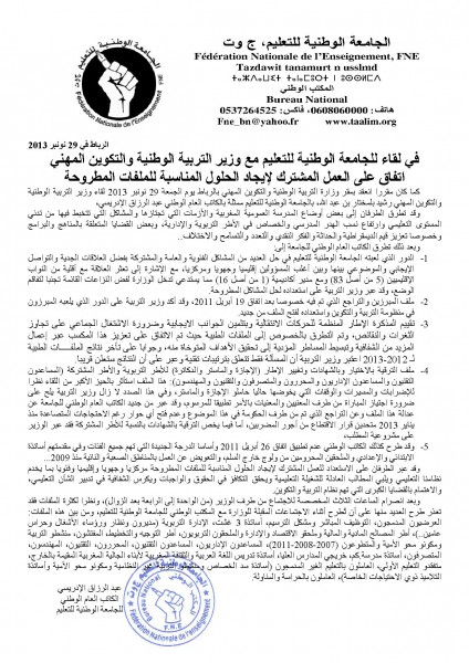 انعقد بمقر وزارة التربية الوطنية والتكوين المهني بالرباط يوم الجمعة 29 نونبر 2013 لقاء وزير التربية الوطنية والتكوين المهني رشيد بلمختار بن عبد الله، بالجامعة الوطنية للتعليم ممثلة بالكاتب العام الوطني عبد الرزاق الإدريسي،
