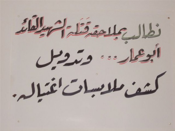 وي 11/11/2004.. حلت كارثة اغتيال الصهاينة الأخ الشهيد القائد أبو عمار رحمه الله.. ونحن نحيي اليوم الذكرى السنوية التاسعة على استشهاده.. والذي أسقطوا غصن الزيتون من يده.. وما زلنا ننتظر كشف ملابسات اغتياله.. والإجابة على الأسئلة التي بقيت مفتوحة.. ونطالب قيادات الشعب الفلسطيني بعد صدور نتائج التحاليل المخبرية الدامغة .. بوقف المفاوضات مع الإحتلال التي أثبتت عبثيتها بشهادتهم.. وشكلت للإحتلال غطاء بالإستمرار في عدوانه وبناء المستوطنات وتهويد الأرض.. والعمل على انعقاد مؤتمر دولي ليتحمل العالم مسؤلياته حول ما يقع من ظلم على شعبنا.. كما ونطالب بتدويل عملية كشف ملابسات اغتيال الشهيد القائد وبذل المزيد من الجهد لملاحقة الجناة وتقديمهم للعدالة الدولية.. فاغتياله هو بمثابة اغتيال للقضية الفلسطينية...!!