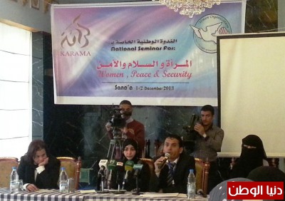 أقامت منظمة يمن للدفاع عن الحقوق والحريات الديمقراطية بالشراكة مع منظمة كرامة الدولية الندوة الوطنية الخاصة بـ المرأة والسلام والأمن على مدى يومين 1-2 ديسمبر في صنعاء