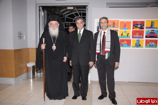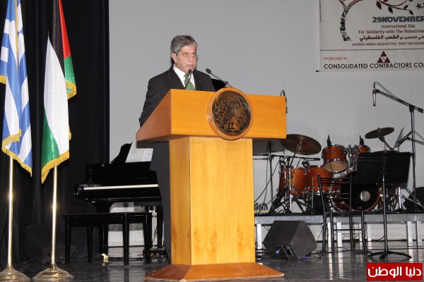 اقامت سفارة دولة فلسطين لدى جمهورية اليونان (بالتعاون مع جمعية الجالية الفلسطينية) مهرجان بمناسبة اليوم العالمي للتضامن مع الشعب الفلسطيني ومرور عام على عضوية فلسطين في الأمم المتحدة، حضرة رئيس الوزراء السابق ورئيس الاشتراكية الدولية السيد جورج باباندريو و غبطة رئيس أساقفة اليونان ايرونيموس، ورئيس لجنة الصداقة البرلمانية اليونانية الفلسطينية السيد اريجيريس دينوبولوس، ورئيس قسم الشرق الأوسط في وزارة الخارجية اليونانية السيد نيقولاس بازيوس، واعضاء من البرلمان اليوناني وممثلين عن الاحزاب اليونانية، ونائب مدير مكتب الأمم المتحدة في اليونان (وعميد الجالية الفلسطينية والعربية رجل الأعمال الشهير السيد سعيد خوري) وعميد السلك الدبلوماسي الأجنبي وعميد السلك الدبلوماسي العربي، وعدد من السفراء وممثلين البعثات الدبلوماسية الأجنبية والعربية المعتمدة لدى جمهورية اليونان، ورؤساء البلديات، ورؤساء الاتحادات