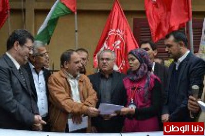 ـ والقى كلمة الجبهة الشعبية لتحريرفلسطين عضو لجنتها المركزية احمد مراد اكد خلالها على التضامن مع الاسرى البواسل في سجون الاحتلال الصهيوني وفي طليعتهم رمز الجبهة الامين العام احمد سعدات ، هؤلاء الاسرى الذين يسطرون اروع ملاحم البطولة دفاعا عن اعدل قضية قضية فلسطين العربية ، واضان نزف لكم انعقاد المؤتمر العام للجبهة السابع ، الذي هو خطوة هامة على طريق النهوض ، وهذا عهد الجبهة الشعبية لكل احرار العالم ، فلسطين ستتحرر بهمة المناضلين ، واشار ان القضية الفلسطينية تمر بأدق مراحلها ، ولكن اسرائيل هي العدو وعن البوصلة لن نحيد، وسيتمكن شعبنا من مواجهة المخططات ، وخاصة مشروع برافر ، الذي يستهدف شعبنا في 48 بهدف تصفية القضية الفلسطينية.