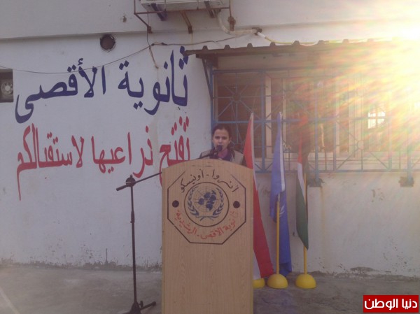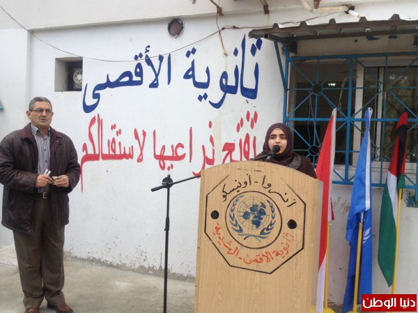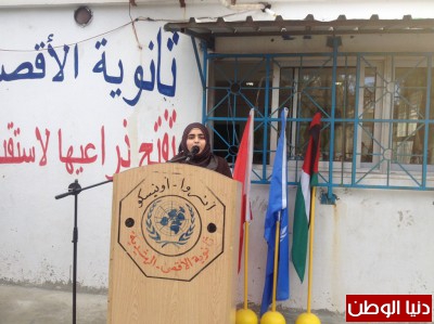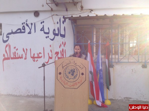 كما نوّهت بدور ثانوية الأقصى التي احتضنت الكثير من الطلبة من ذوي الاحتياجات الخاصة كالطالبة رشا يوسف ومحمد موسى ومروة طلال عيسى الذين أبدوا نجاحا باهرا في الامتحانات الرسمية. وكانت مقدمة الكلمة الطالبة المميزة سارة حجّو.