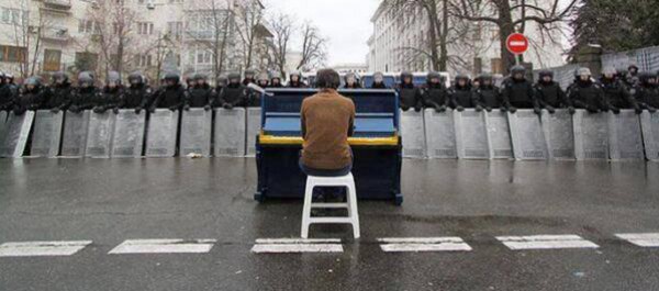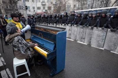 واجه المتظاهرون الأوكرانيون، المطالبون بإسقاط الرئيس، قوات الشرطة بالعزف على البيان والغناء، وكشفت صورا تداولها نشطاء علي مواقع التواصل الاجتماعي قيام متظاهر بالعزف علي البيانو، في مواجهة الشرطة، وهو ما فعلته متظاهرة أخرى، بحسب صورة ثانية، فيما قام متظاهر ثالث بالغناء.