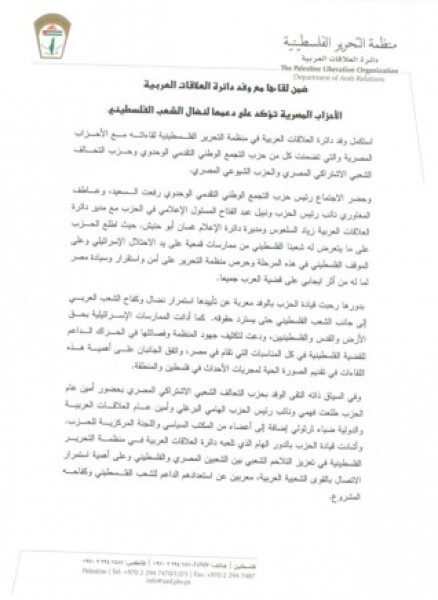 استكمل وفد دائرة العلاقات العربية في منظمة التحرير الفلسطينية لقاءاته مع الأحزاب المصرية والتي تضمنت كل من حزب التجمع الوطني التقدمي الوحدوي وحزب التحالف الشعبي الاشتراكي المصري والحزب الشيوعي المصري.