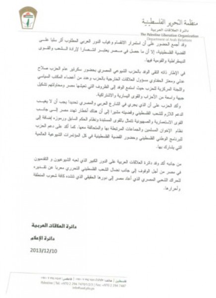 بدورها رحبت قيادة الحزب بالوفد معربة عن تأييدها استمرار نضال وكفاح الشعب العربي إلى جانب الشعب الفلسطيني حتى يسترد حقوقه. كما أدانت الممارسات الإسرائيلية بحق الأرض والقدس والفلسطينيين، ودعت لتكثيف جهود المنظمة وفصائلها في الحراك الداعم للقضية الفلسطينية في كل المناسبات التي تقام في مصر، واتفق الجانبان على أهمية هذه اللقاءات في تقديم الصورة الحية لمجريات الأحداث في فلسطين والمنطقة.