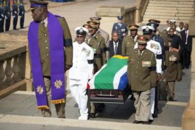 حمل حرس الشرف من العسكريين النعش الذي يضم جثمان الزعيم الافريقي الراحل نيلسون مانديلا من فوق العربة التي كانت تحمله، إلى داخل مقر حكومة جنوب إفريقيا (يونيون بيلدينجز) ليسجى لالقاء النظرة الاخيرة عليه.