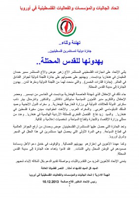 اتحاد الجاليات والمؤسسات والفعاليات الفلسطينية في أوروبا يثني على انجازات الفلسطيني المستثمر