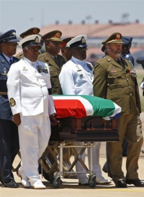 نقل جثمان نلسون مانديلا من المستشفى العسكري في بريتوريا الى قاعدة وتركلوف الجوية القريبة السبت حيث بدأت رحلته الأخيرة الى مسقط رأسه في كونو حيث سيدفن الأحد.