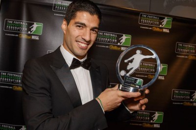 تُوج اللاعب الاوروجوياني لويس سواريز مهاجم ليفربول الانجليزي بجائزة لاعب العام المقدمة من اتحاد مشجعي كرة القدم في انجلترا مساء أمس على استاد الامارات "ملعب ارسنال" في لندن.