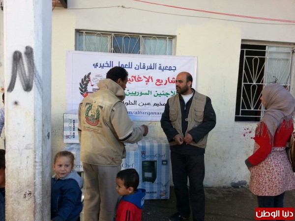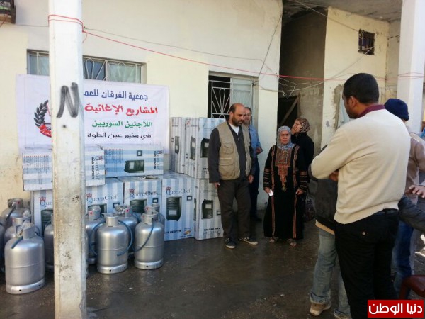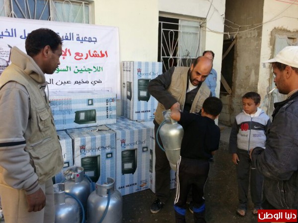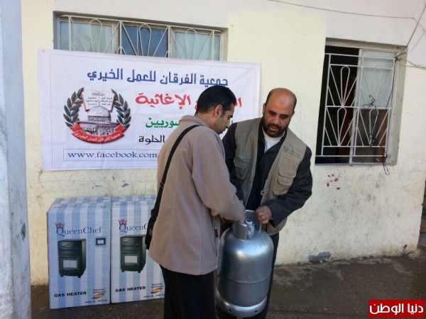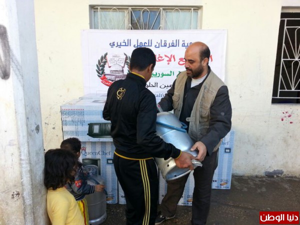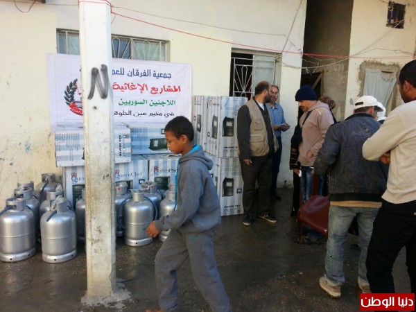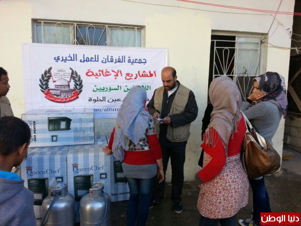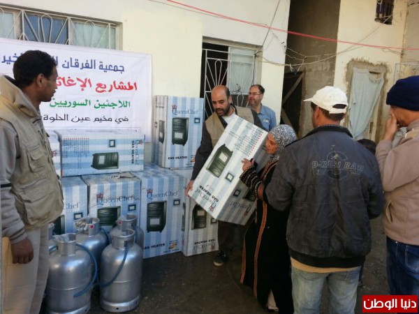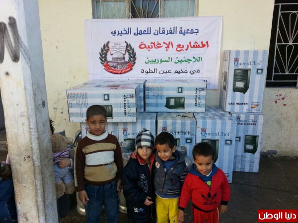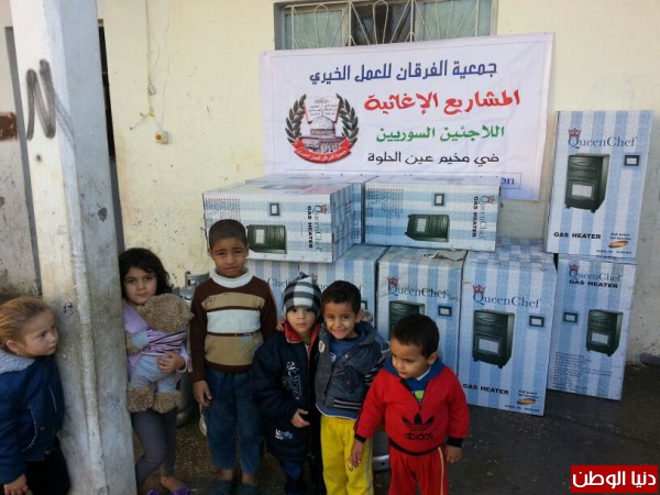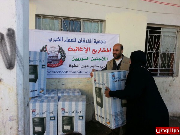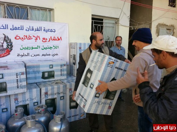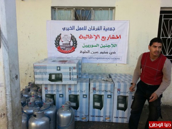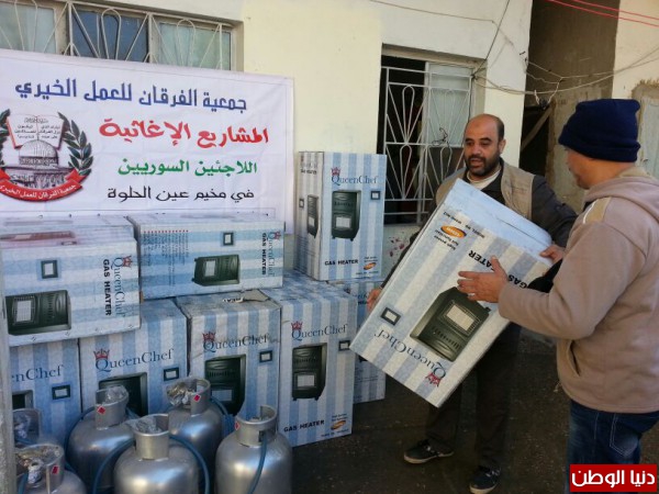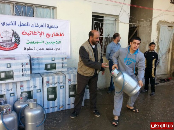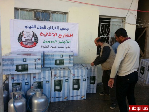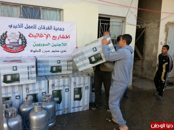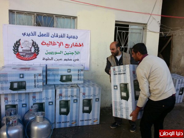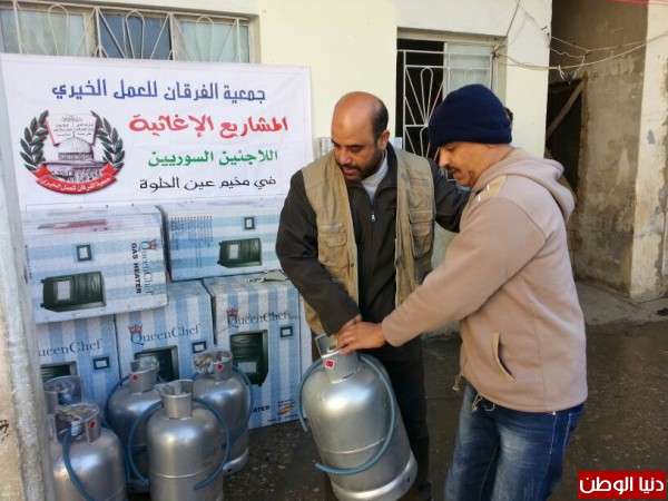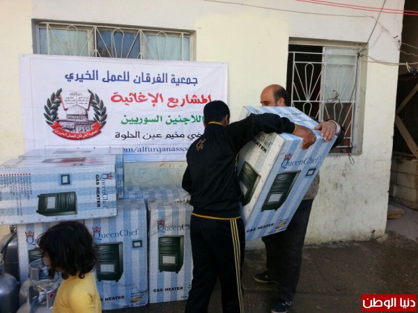 ضمن المساعدات التي تقدمها جمعية الفرقان للعمل الخيري في مخيم عين الحلوة قامت الجمعية وبتمويل من فاعل خيربتوزيع عدد من الدفايات وجرات الغازعلى الأسر السورية النازحة الى مخيم عين الحلوة لتخفيف معاناتهم مع البرد القارس هذه الأيام.