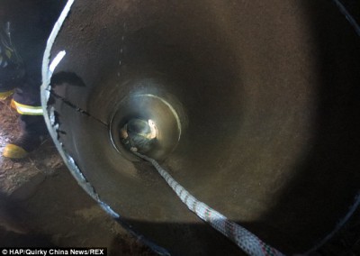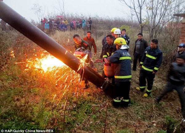 نشرت صحيفة الديلي ميل صورا لعملية نقاذ طفل علق في أنبوبة عميقة .
