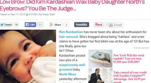 أثارت موجة من التعليقات المسيئة علي الانترنت غضب كيم كارداشيان، بعدما نشرت صورة لابنتها نورث على الانترنت، عقب اتهامها بتهذيب حواجب الرضيعة باستخدام الشمع.