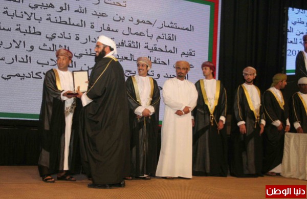 بمناسبة العيد الثالث والأربعون المجيد لميلاد نهضة سلطنة عُمان الشقيقة على يد السلطان قابوس بن سعيد كرّم سعادة القائم بأعمال سفارة سلطنة عُمان لدى المملكة الأردنية الهاشمية المستشار حمود بن عبد الله الوهيبي الخريجين والخريجات من الطلبة العُمانيين بالأردن لمختلف المراحل التعليمية الذين نهلوا من زاد العلم والمعرفة متسلحين بالوعي والايمان والثقافة والمؤهلات العلمية متعطشين للانضمام لاخوانهم واخواتهم أبناء الشعب