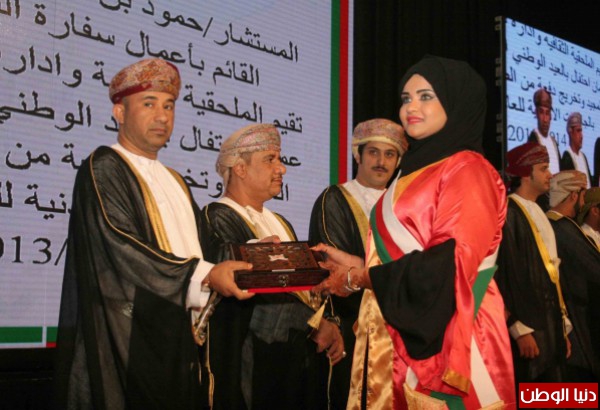 حيث اقام نادي الطلبة العُمانيون بالأردن بالتعاون مع الملحقية الثقافية العمانية احتفالا بمناسبة العيد الوطني العماني الثالث و الاربعون جرى خلاله تكريم الطلبة العمانيين الخريجين من الجامعات الاردنية للعام الدراسي2013/2014 مساء يوم الجمعة 20/12/2013 على مسرح قصر الثقافة بمدينة الحسين للشباب تخلله فقرات فنية تراثية قدمها عدد من الطلبة بمشاركة فرقة معان للفنون الشعبية التي نالت أعجاب الحضور ولاقت تفاعلا كبيرا ورعى الحفل سعادة القائم بأعمال السفارة لدى المملكة الأردنية الهاشمية المستشار حمود بن عبد الله الوهيبي بحضور الدكتور عبد الله الشقصي الملحق الثقافي بالسفارة العمانية و عمر حامد المدهون رئيس نادي طلبة سلطنة عمان في الاردن ، وحضر الحفل أعضاء من السلك الدبلوماسي العماني بالمملكة الأردنية الهاشمية والملحق الثقافي.