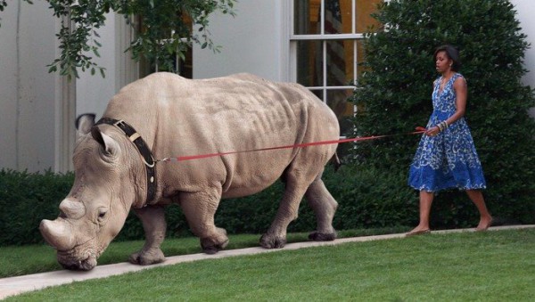تفاجا السياح و الناس و كل من شاهد البيت الابيض من خارج الاسوار هذا الصباح عند رؤية السيدة الاولى ميشيل اوباما تتمشى في الحديقة الجنوبية للبيت الابيض بصحبة وحيد القرن الاليف الخاص باسرتها و اسمه تشونسي.