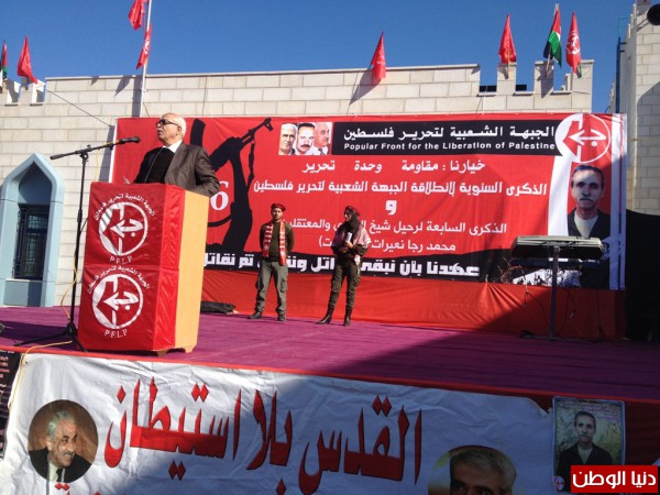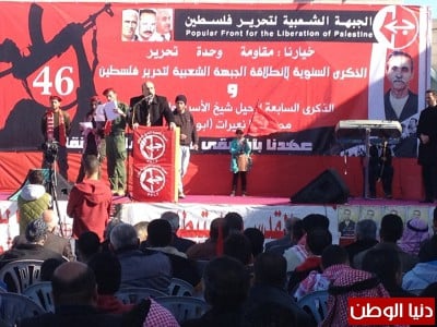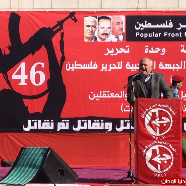 اما عضو اللجنة التنفيذية لمنظمة التحرير الفلسطينية الرفيق صالح رأفت فقد هنأ الجبهة الشعبية لتحرير فلسطين في ذكرى انطلاقتها الـ46 موجهاً تحياته الى الرفيق الامين العام الاسير احمد سعدات وكافة الاسرى في سجون الاحتلال، وقال؛ إننا نحتفل اليوم في هذه الذكرى، وما زال الاحتلال يدمر ويخرب ومستخدماً عدوانه على كافة معاني الحياة الفلسطينية حيث أن حملات الإعتقالات والاغتيالات ونهب الأراضي ومصادرتها وتوسيع المستوطنات مستمر، في وقت أن المفاوضات العبثية مستمرة، ووضع آليات لتسوية الصراع العربي الصهيوني وفي جوهره القضية الفلسطينية من اجل الزام كيان الاختلال بالانسحاب الكامل من الاراضي المحتلة والعمل على تمكين شعبنا الفلسطيني من اقامة دولته، ورفض الاستمرار في المفاوضات التي تمكن اسرائيل من استمرار سياستها العدوانية، وبالتالي يجب الدعوة المستمرة للوحدة الوطنية من أجل إنهاء الإنقسام الذي أضعف قضيتنا بالكامل، وذلك بتنفيذ الاتفاقات السابقة في القاهرة والدوحة، وتشكيل حكومة وحدة وطنية وتحديد موعد لانتخابات تشريعية ورئاسية، وكذلك العمل على تصعيد المقاومة الشعبية بكافة اشكالها ضد الاحتلال حتى زواله، ووضع إستراتيجية جماهيرية وطنية شاملة من أجل تحرير الأسرى القابعين في سجون الاحتلال، خصوصا أنهم ناضلوا وضحوا من أجل وطنهم ويجب العمل من أجلهم، واستئناف الهجوم السياسي والدبلوماسي بكافة أشكاله على مستوى المحافل الدولية ومن خلال هيئة الأمم المتحدة وكافة المحافل الدولية والتوجه للانضمام لكل الاتفاقيات والمعاهدات وفي مقدمتها اتفاقية جنيف واتفاق روما من أجل محاكمة إسرائيل على جرائمه وإرغامها على الانسحاب من الأراضي الفلسطينية المحتلة وعودة اللاجئين وتحقيق الثوابت الوطنية بالكامل، وختم رأفت كلمته بالدعوة لمواصلة العمل من اجل بناء نظام سياسي فلسطيني على الاسس التي حددتها وثيقة الاستقلال بترسيخ الديمقراطية وتحقيق العدالة الاجتماعية وضمان الحريات العامة والشخصية والمساواة الكاملة بين كل فئات المجتمع.