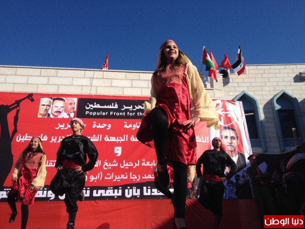 وتخلل الاحتفال فقرات وطنية من غناء للفنان الفلسطيني سالم عمران ودبكة ورقص فليكلوري لفرقتي حنظلة والبيدر.