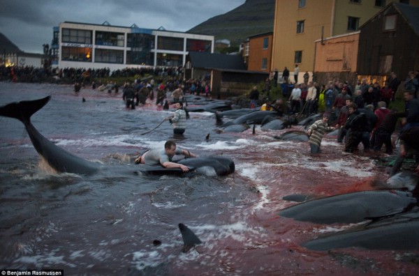 بالصور والفيديو :حفاظا على تقليد عمره 400 عام .. مجزرة الحيتان في قرية نائية