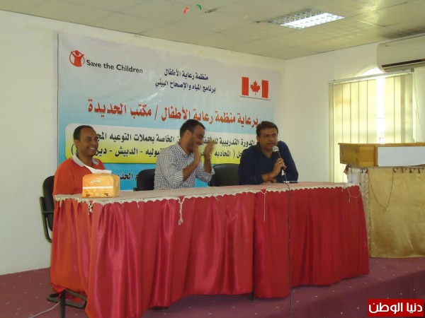 تتواصل على قاعة مؤسسة التواصل للتنمية الانسانية بمدينة الحديدة الدورة لتدريبية للمثقفين الصحيين الخاصة بحملات التوعية المجتمعية حول المياه والاصحاح البيئي والتي ينظمها منظمة رعاية الأطفال الدولية بمشاركة 100 مشارك ومشاركة من مديرية باجل من مناطق ( المحادبة – العرج – التربة – المقبولية – الدبيش – دير حمزة ) وتستمر للفترة من 21 - 26 ديسمبر الجاري 2013م .