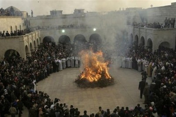 في العراق، يحتفل المسيحيون بالميلاد بإيقاد نار أمام منازلهم بإحراق أغصان وأشواك لاعتقادهم بأن هذا سيحقق لهم ثروة. ويقوم بعضهم بالقفز فوق النار ثلاث مرات حين تنطفئ كفأل جيّد.