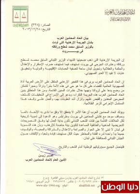 إن اتحاد المحامين العرب يرى فى هذا التفجير الإرهابي المتنقل على الأرض العربية أداة للصهيونية العالمية للقضاء على كل ما هو حي فى هذه الأمة بشراً وتراثاً وحجراً لتتمكن من وضع يدها على ثرواتنا ونهبها خلال عشرات السنين القادمة. ومن هذا المنطلق يدين اتحاد المحامين العرب هذه الجريمة النكراء،