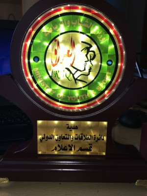 وقد سلّم قسم الإعلام في دائرة العلاقات والتعاون الدولي في وزارة الشباب والرياضة برعاية الوزير المهندس جاسم محمد جعفر درعاً تكريمية لإذاعة سومر أف.أم. على التفاتتها نحو هذا الشاب والإضاءة على موهبته وإنجازاته، وعلى فوزها في المسابقة التي ضمت مختلف الوسائل الإعلامية المرئية والمسموعة والمكتوبة.