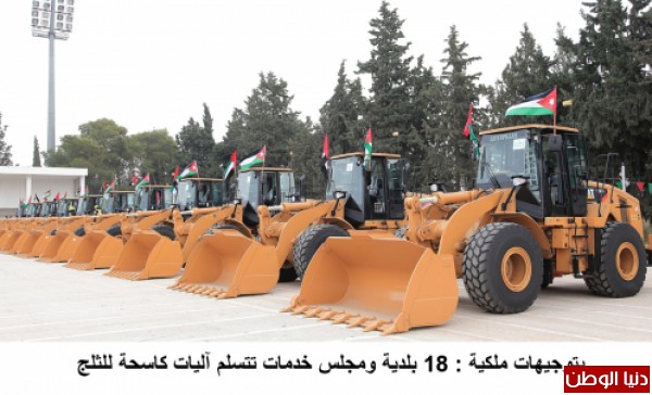 بتوجيهات من جلالة الملك عبدالله الثاني تسلمت 18 بلدية ومجلس خدمات في المملكة 22 آلية ثقيلة مخصصة للتعامل مع الظروف الجوية الصعبة، قدمتها دولة الإمارات العربية المتحدة، بمبادرة من ولي عهد أبوظبي الفريق الأول سمو الشيخ محمد بن زايد آل نهيان نائب القائد الأعلى للقوات المسلحة؛ تجسيدا لعمق العلاقات
