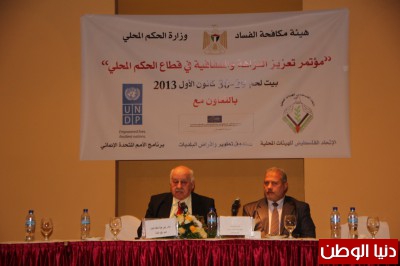 ففي اليوم الثاني للمؤتمر الذي يعقد بتعاون مشترك بين هيئة مكافحة الفساد، ووزارة الحكم المحلي، والاتحاد الفلسطيني للهيئات المحلية، وصندوق تطوير وإقراض البلديات، وبرنامج الأمم المتحدة الإنمائي UNDP ، بحضور وزير الحكم المحلي سائد الكوني ورئيس هيئة مكافحة الفساد رفيق النتشه، ورؤساء الهيئات المحلية، ومسؤولي وزارة الحكم المحلي وهيئة مكافحة الفساد وصندوق تطوير البلديات، وعدد ممن الخبراء والقانونيين، وناقش المشاركون في المؤتمر العديد من القضايا والمداخلات التي طرحت من مجموعه من المسؤولين والخبراء في هذا المجال.