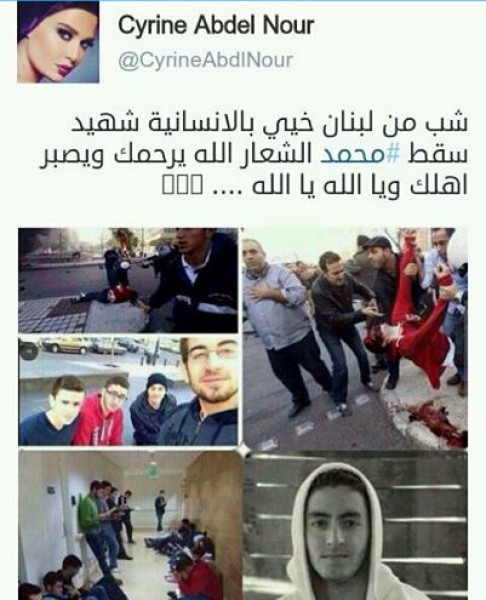 وكتبت : " شب من لبنان خيي بالانسانية شهيد سقط محمد الشعار الله يرحمك ويصبر اهلك ويا الله يا الله ... " .