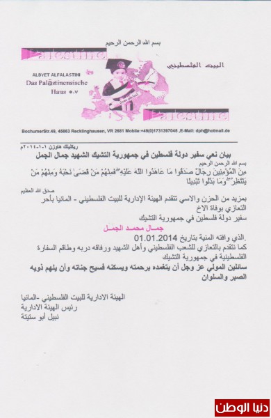 أصدر البيت الفلسطيني فى المانيا بيان نعي سفير دولة فلسطين في جمهورية التشيك الشهيد جمال الجمل .